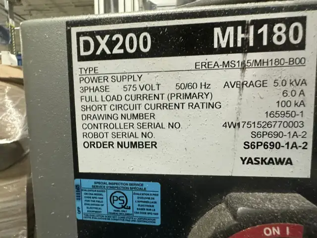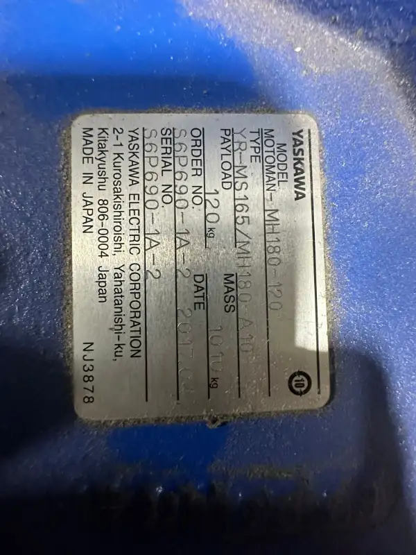 Yaskawa Motoman MH180-120 robot 6-axis MH180-120; S6P690-1A-2; 575V; 50/60Hz; 5.0kVA; 100 kA, Payload 120kg, Reach 2058 mm, Repeatabiity, 0.2mm, Weight 1010kg, 6 Axes. This Motoman MH180-120 Robot is 6 axis, offering 120kg payload. Common application is additive manufacturing, assembly, material handling, palletizing and remote TC. Manufactured by Yaskawa Motoman.. Comes with DX200 controller and pendent. Working condition. Date: 2017-04.