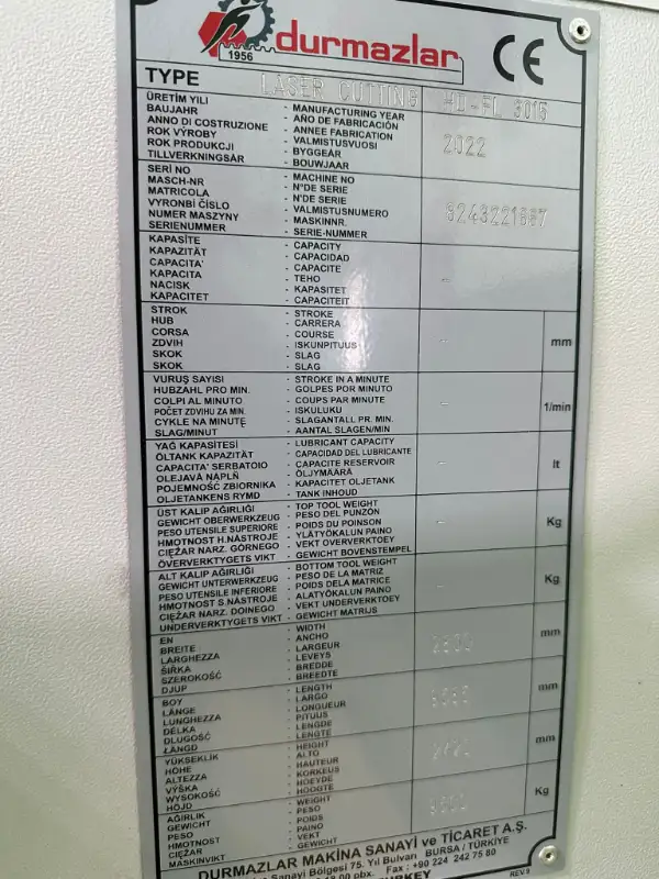 2022 DURMA HDF-L 3015 V 12,000 WATT FIBER LASER.