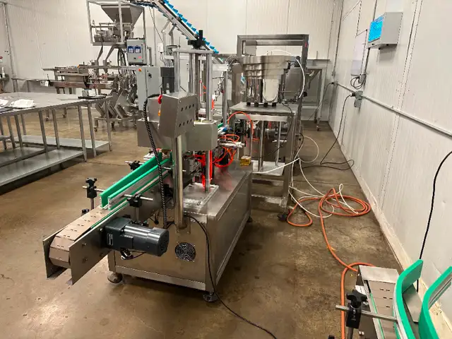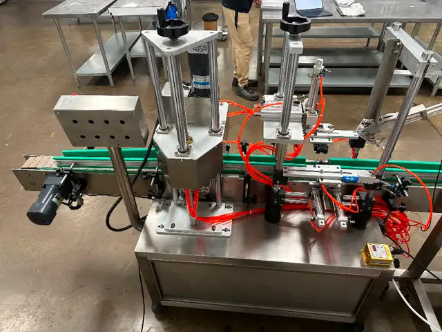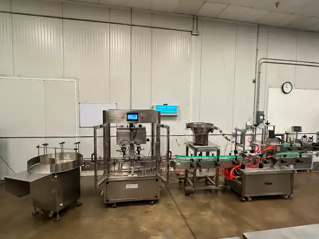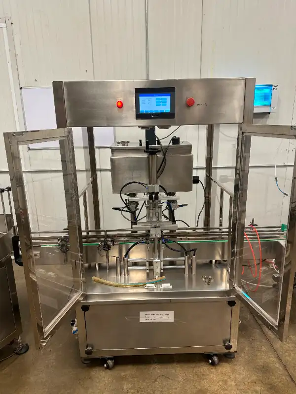 GUANGZGOU HMD COSMETICS MACHINERY BOTTLE FILLING MACHINE WITH WEINVIEW COLOUR TOUCH SCREEN HMI CONTROL AND STAINLESS STEEL TURNTABLE. 600 BOTTLES PER HOUR, MAX 250ML BOTTLE CAPACITY, COMES WITH 2 HOPPERS.