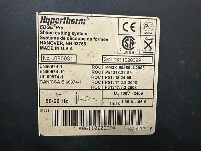2011 PINNACLE WHISTLER HP 6' X 12' HIGH DEFINITION PLASMA CUTTING TABLE WITH HYPERTHERM HPR130XD PLASMA CUTTING SYSTEM (M/N: 078553, 600V, 3PH, 60HZ) AND HYPERTHERM EDGE PRO SHAPE CUTTING CONTROL SYSTEM (M/N: 090031, 100V-240V, 1PH, 50/60HZ).